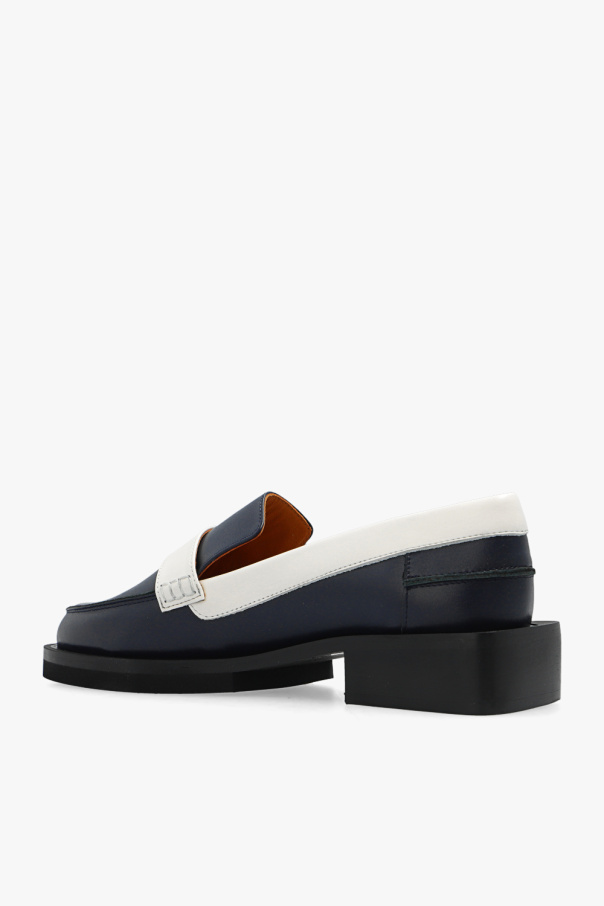 Navy blue and white moccasins from Ganni. Made of leather, this model sits on a black rubber sole and showcases a glossy appliqué.