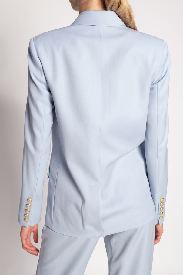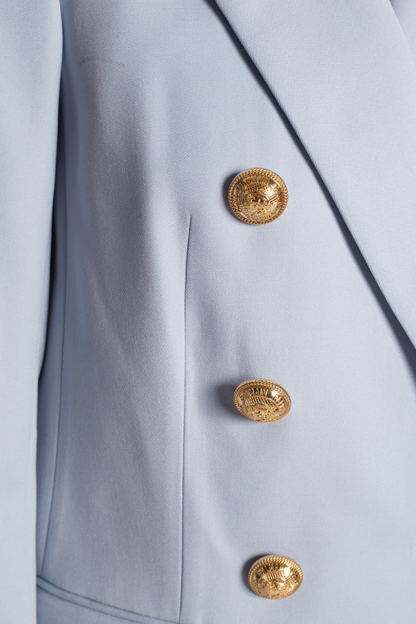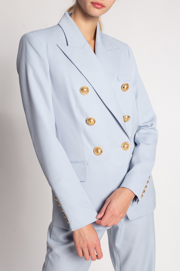 Light blue double-breasted blazer from Balmain. Made of wool, this garment features decorative buttons, one slip pocket, two flap pockets and gold-tone metal hardware.