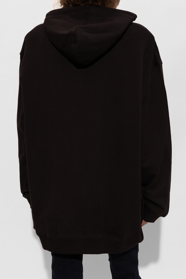 Introducing the oversized black hoodie from the illustrious fashion house, Versace Jeans Couture. This garment epitomizes the fusion of high-fashion and street style, crafted from the finest cotton for a superior softness and comfort. The hoodie features a loose fit with a generous hood and long sleeves, complemented by shoulder pads for an elevated silhouette. The front showcases a striking print of a white swan, embellished with gothic inscriptions and the prominent word \"COUTURE\" in bold pink. An intricate chain motif surrounds the design, with the phrase \"SAVAGE FURY IN VANDAL BEAUTY\" adding a touch of rebellious elegance. The back is minimalist, allowing the front to take center stage. Additionally, practical side pockets enhance its functionality. Why choose this product? Exclusive design by Versace Jeans Couture Luxe comfort with 100% cotton fabric Statement print with gothic and avant-garde elements Functional side pockets for convenience