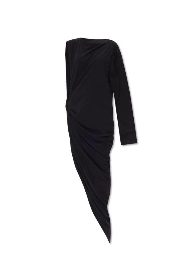 Black ‘Edfu’ dress from Rick Owens DRKSHDW. This loose-fitting, boxy design features one long sleeve and an asymmetric train.