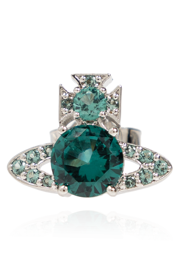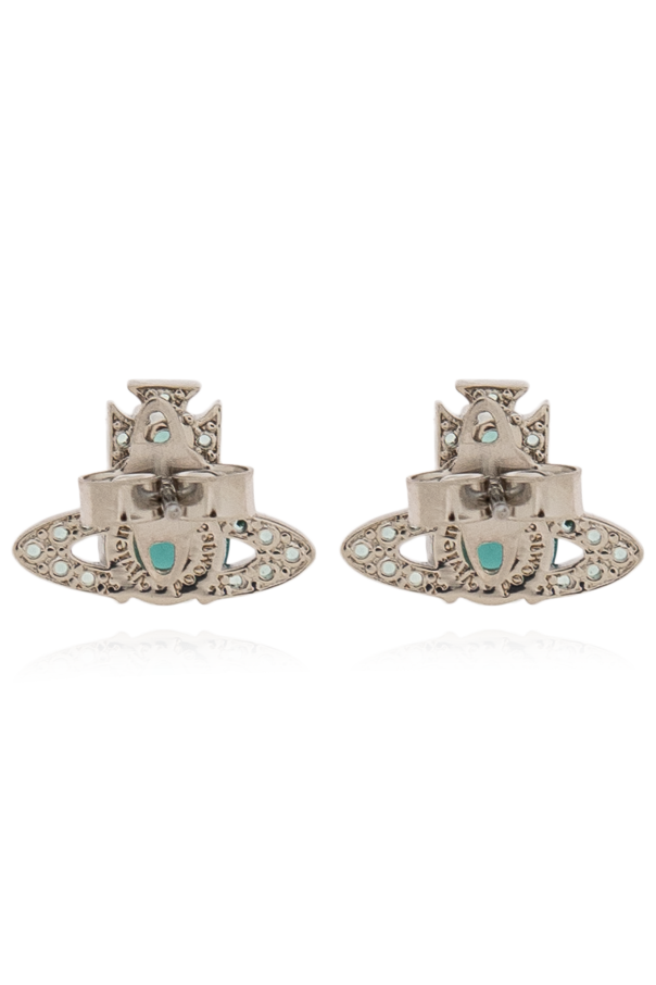 Introducing the Vivienne Westwood Logo Earrings, an epitome of luxury and sophisticated craftsmanship. These exclusive earrings, designed by the renowned Vivienne Westwood, are a true testament to her iconic and rebellious style that has captivated the fashion world since the 1970s. These earrings feature a unique, geometric shape reminiscent of a planet encircled by a ring. The centerpiece is a large, round green stone, exquisitely surrounded by smaller, shimmering stones, all set on a meticulously crafted silver base. The intricate back detailing adds a touch of elegance and exclusivity. Fabricated from premium quality silver and adorned with striking green stones, these earrings exude a luxurious aura. The silver base is finely decorated, enhancing the overall opulence of the design. Although there are no visible logos or inscriptions, the distinctive design unmistakably suggests a creation by a prestigious brand. Why Choose These Earrings? Designed by the legendary Vivienne Westwood. Exquisite green and silver color palette. Unique, geometric design that stands out. High-quality materials ensure durability and elegance. Perfect for adding a touch of luxury to any outfit.