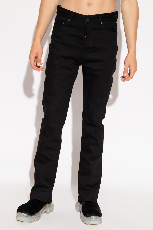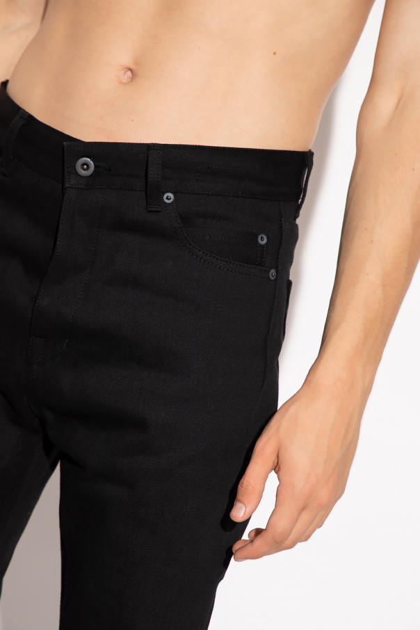 Black jeans from Rick Owens DRKSHDW. Falling with slightly tapered legs, this pair features button fastenings and six pockets: four on the front and two at the back.