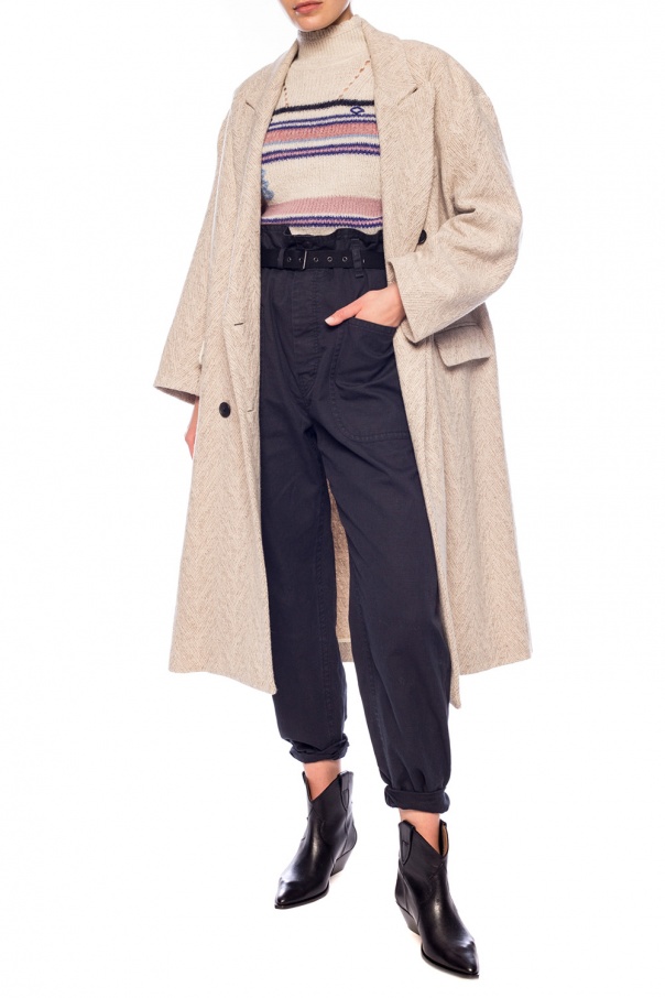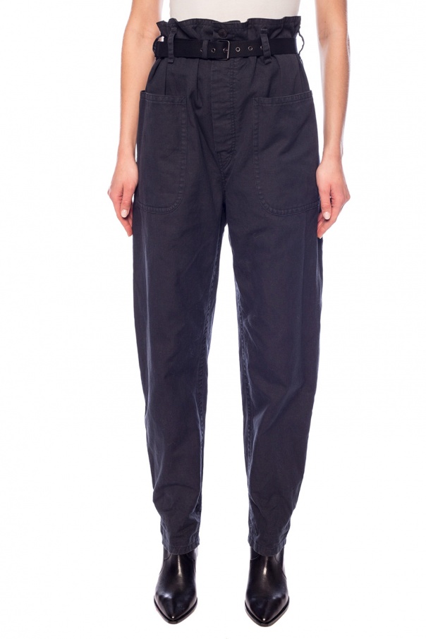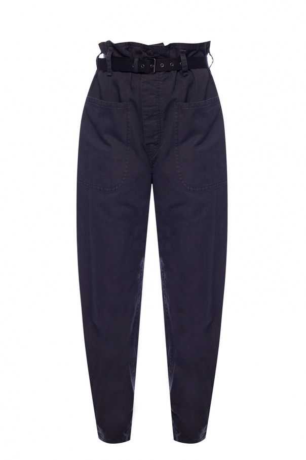 Navy blue high-waisted trousers from Isabel Marant Étoile featuring button fastening, buckle belt at the waist as well as 2 inset front pockets and 2 welt rear pockets.