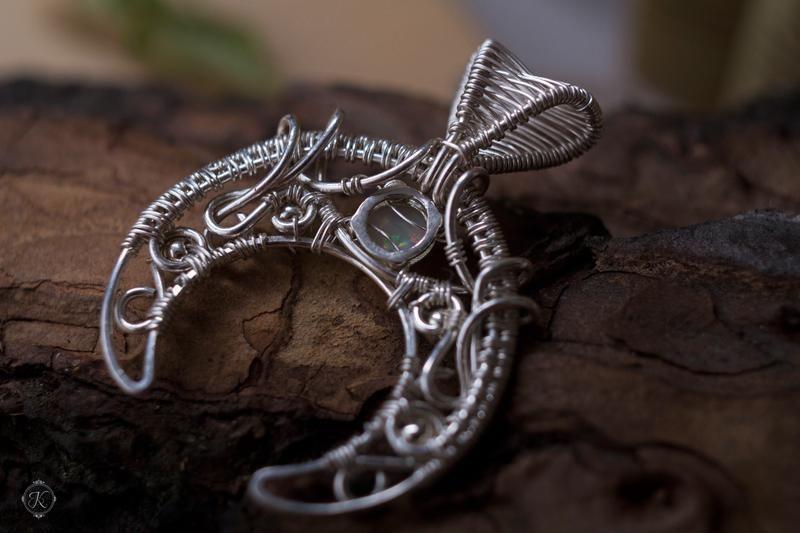 Серебряный кулон лунница с опущенными вниз "рожками" выполненный в технике wire wrap и заполнен ажурным рисунком. Внутри него сверкает яркий опал, надежно зафиксированный четырьмя лапками каста. Также кулон декорирован серебряными бусинами, символизирующими звезды.