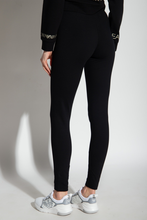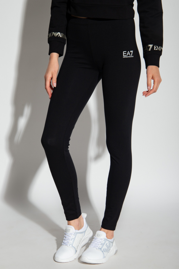 Black leggings from EA7 Emporio Armani. Made of cotton, they feature an elasticated waistband, narrow legs and a printed white logo.