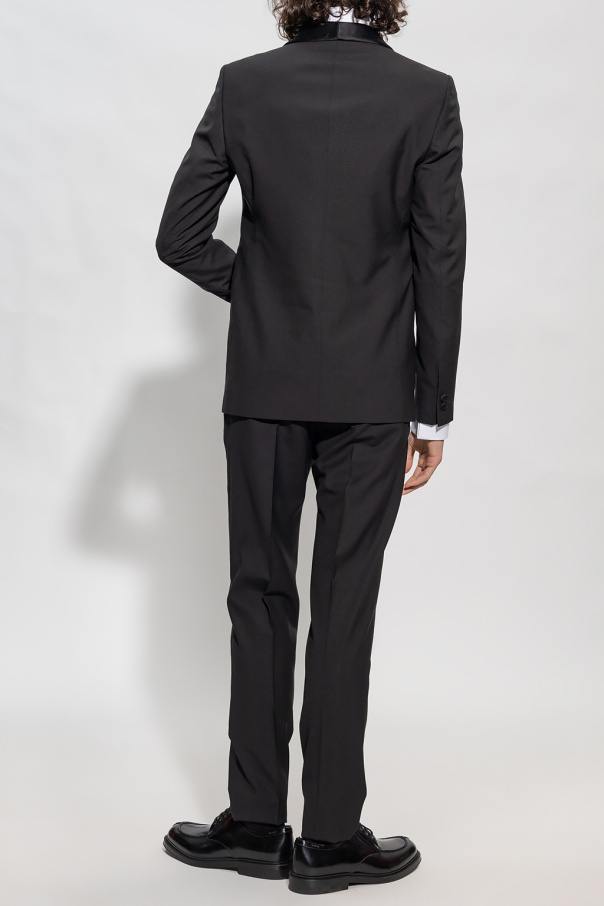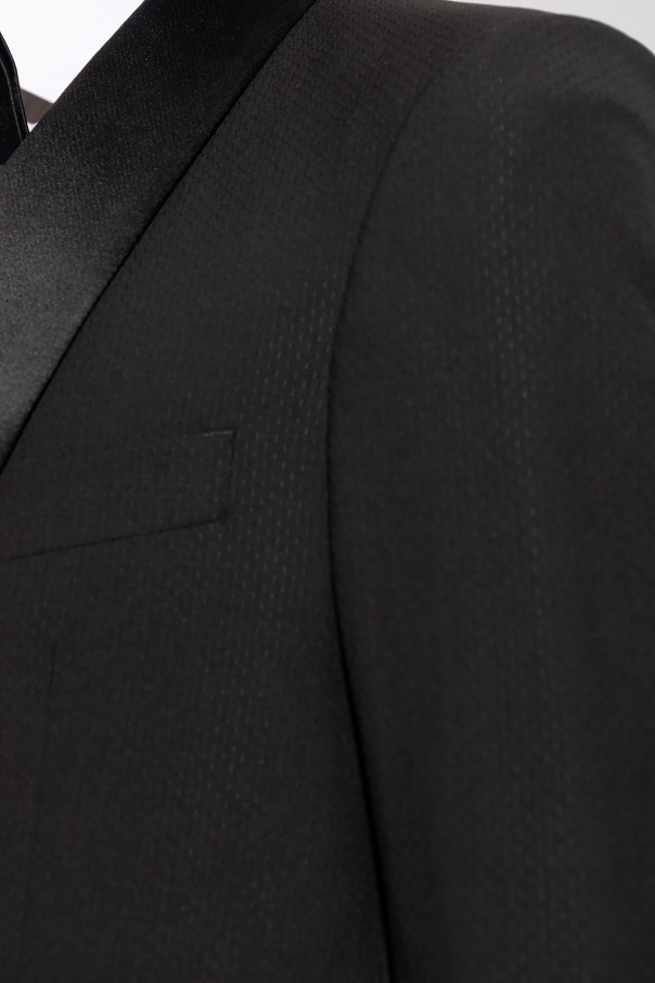 Black suit from Emporio Armani. Made of a wool and silk blend. The blazer fastens with a button and features three slip pockets, shawl lapels and a pinstripe pattern. The pleat-front trousers feature a zip and hook fastening as well as four pockets.