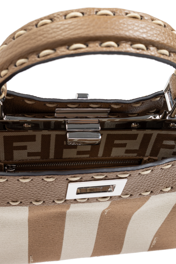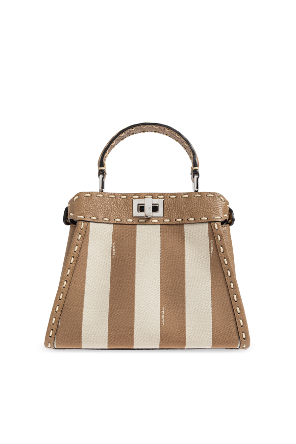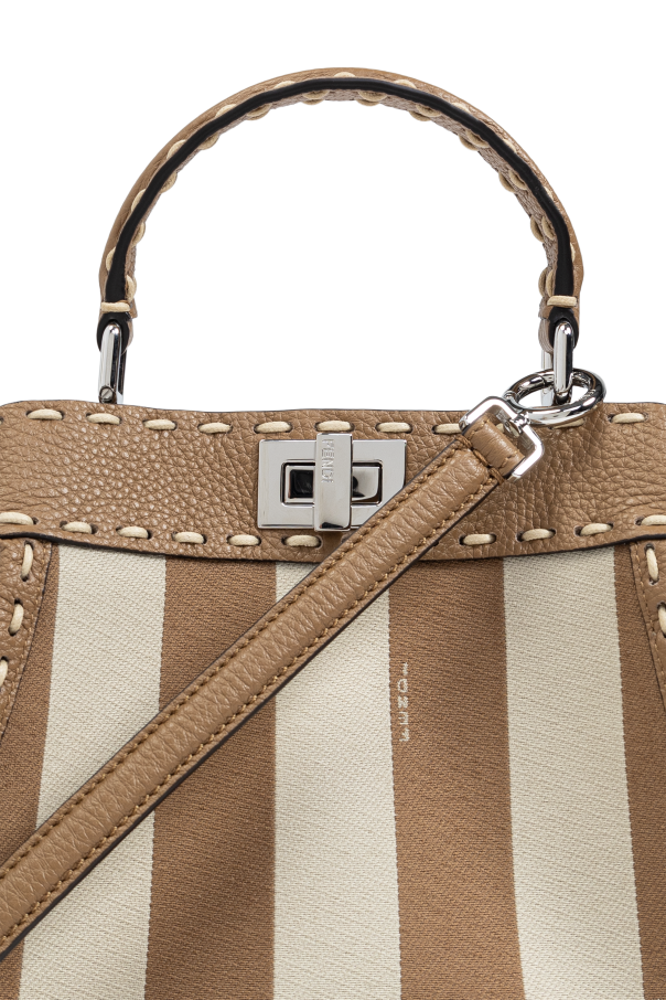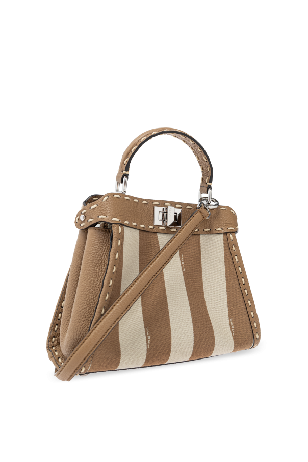 Introducing the Peekaboo Shoulder Bag from the exclusive collection of Fendi, an embodiment of elegance and functional design. Crafted from the finest leather, this trapezoidal masterpiece boasts vertical stripes in sophisticated shades of brown and beige, delivering a classic yet contemporary aesthetic. The bag\'s distinctive \"ears\" that protrude at the top edge add a unique flair, making it an unmistakable piece from Fendi\'s luxurious lineup. The Peekaboo bag is meticulously detailed with silver metal hardware, including a sleek zipper and clasp closure at the top. A subtle metal accent adorns the front, serving either as a functional part of the closure mechanism or a decorative touch. For versatile carrying options, it features a handle in matching material and color, along with a long, detachable strap that allows for shoulder or crossbody wear. This strap is adjustable and embellished with metal details, enhancing the bag\'s exquisite appeal. The interior is just as impressive, divided into two compartments with a slot for cards and a zippered pocket for secure storage. Its cream-beige color scheme exudes a serene elegance, making it a perfect accessory for any outfit. Why Purchase This Product? Exclusivity: A distinct piece from Fendi\'s renowned collection, offering unmatched style. Versatility: Equipped with both a handle and a detachable strap for multiple carrying options. Functionality: Ample storage with interior compartments, card slot, and a zippered pocket. Timeless Design: Classic color palette and elegant structure, ensuring it never goes out of style.