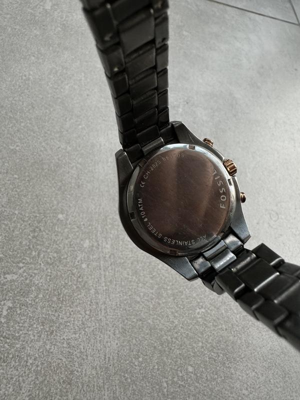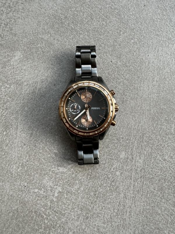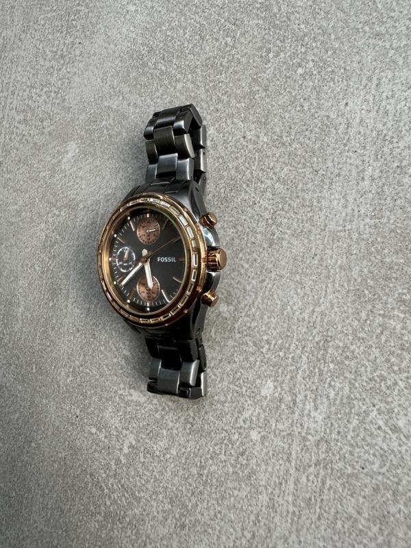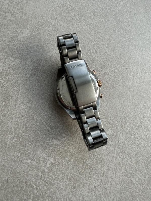 Корпус и браслет из нержавеющей стали с ионным покрытием Smoke. Безель с фиксированным покрытием розового золота с багетными камнями. Серый циферблат со стрелками розового золота и часовыми метками. Метки минут вокруг внешнего края. Тип циферблата: аналоговый. Люминесцентные стрелки и маркеры. Хронограф - три дополнительных циферблата, отражающих: 60 секунд, 30 минут и 24 часа. Кварцевый механизм. Устойчивое к царапинам минеральное стекло. Потяните / толкните заводную головку. Тверда задня кришка. Диаметр корпуса: 38 мм. Толщина корпуса: 12 мм. Круглая форма корпуса. Ширина ленты: 16 мм. Откидная застежка с безопасной разблокировкой. Водонепроницаемость на глубине 100 метров / 330 футов. Функции: хронограф, дата, час, минута, секунда. Повседневный стиль часов. Женские часы Fossil Dylan Chronograph Smoke с ионным покрытием CH2825.