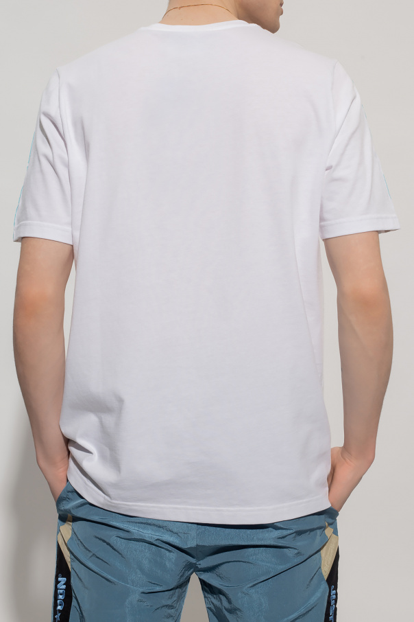 White T-shirt from ADIDAS Originals. Crafted from cotton, this short sleeve design features a logo detail, the label’s signature three stripes in cream and blue as well as a ribbed crew neck.