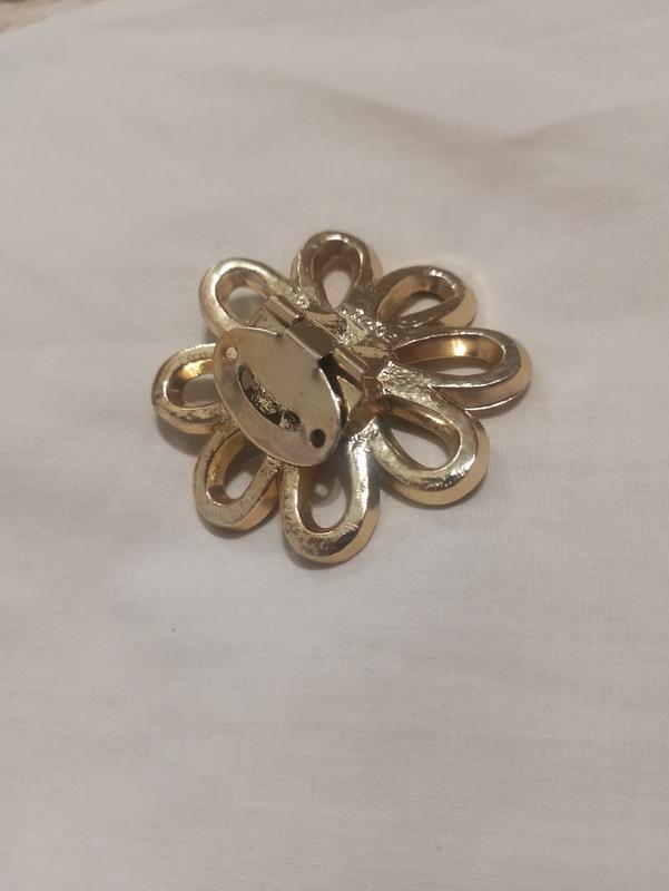 Большой красивый зажим в виде цветка.Крепко держится на любой ткани благодаря застежке с зубцами.