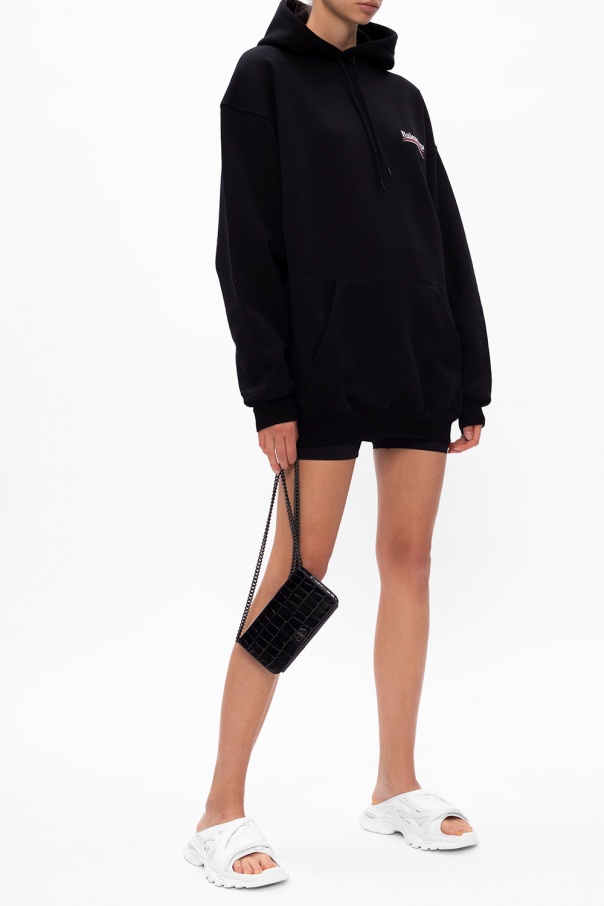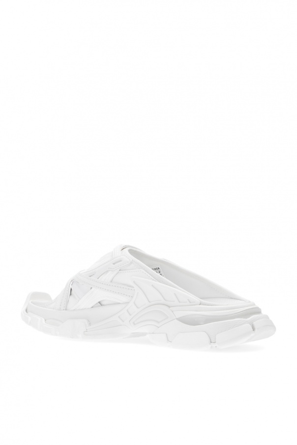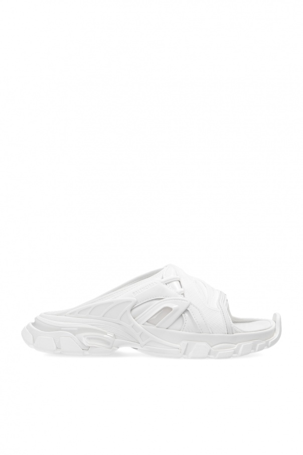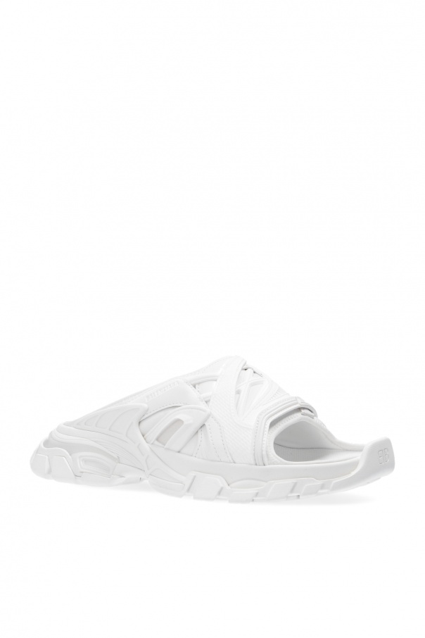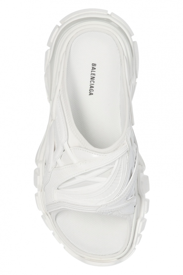 White ‘Track’ slides from Balenciaga. Set on a white platform rubber outsole, this pair is embellished with an embossed logo of the brand.