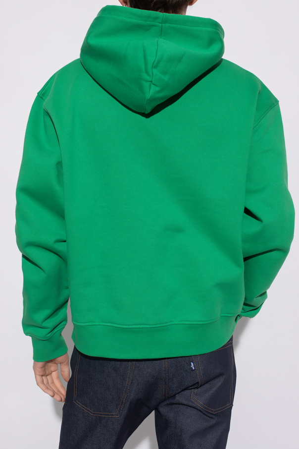 Green sweatshirt with a drawcord-adjustable hood from Jacquemus. Crafted from organic cotton, this style features a white graphic print with the designer's logo, a kangaroo pocket and a ribbed bottom hem and cuffs.