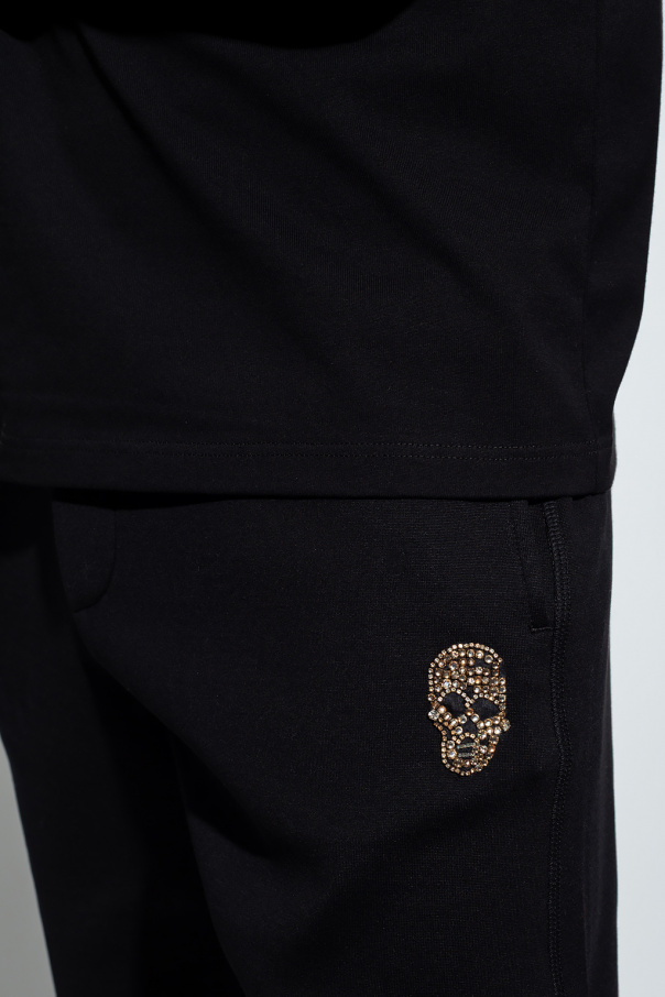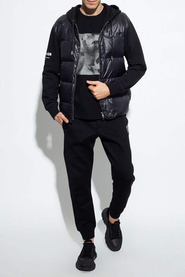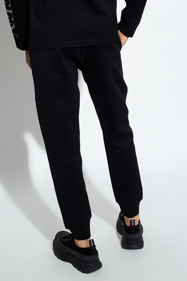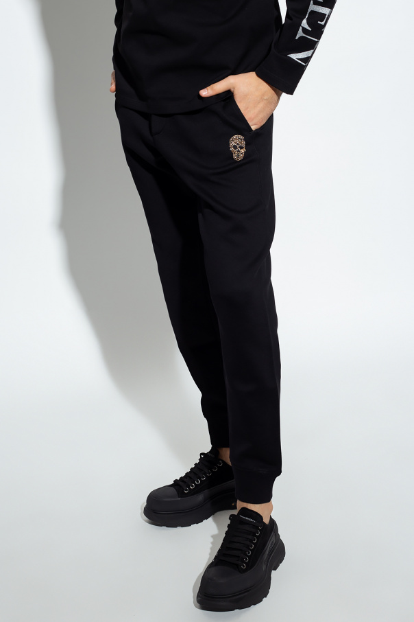 Black sweatpants from Alexander McQueen. Made of silk, this pair features a zip fastening, elastic waistband with drawstrings, appliquéd logo in brown, silver-tone and gold-tone, two front pockets, two back pockets and elasticated cuffs.