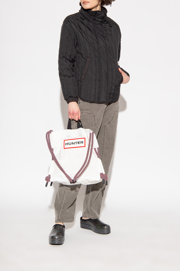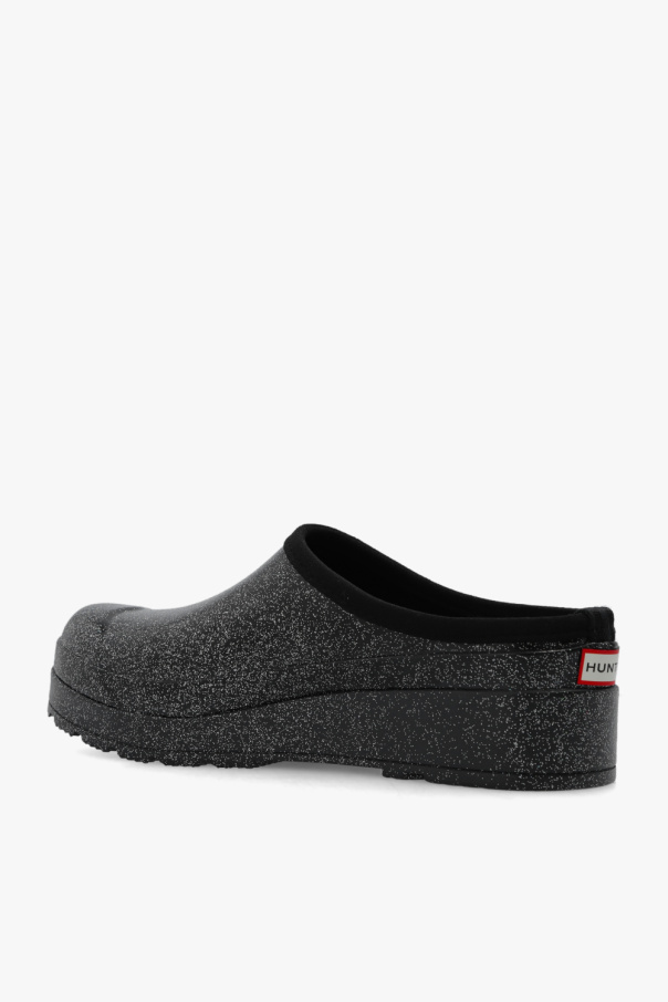 Black ‘Play Starcloud’ slides from Hunter. Made of recycled polyester and rubber, this waterproof pair features glitter and a black rubber sole.