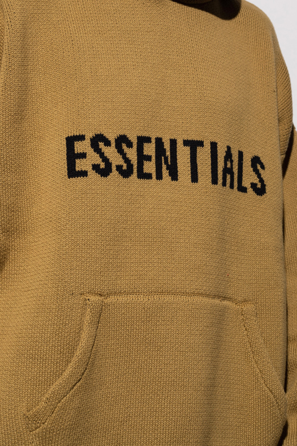 Green hooded knitted sweater from Fear Of God Essentials. Decorated with a black logo embroidery, this garment is complete with a front pocket, logo-patched hoodie and long sleeves with elasticated cuffs.