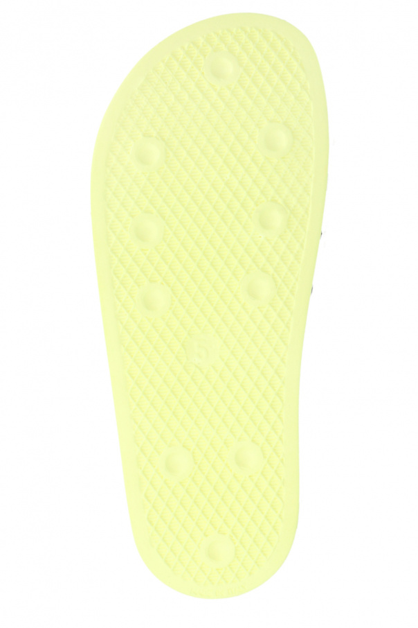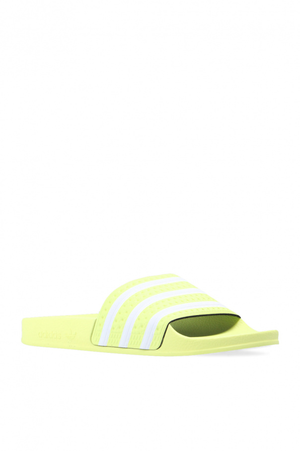 Neon yellow ‘Adilette’ slides from ADIDAS Originals. Resting on a neon yellow rubber sole, this pair is decorated with the label’s signature three stripes in white.