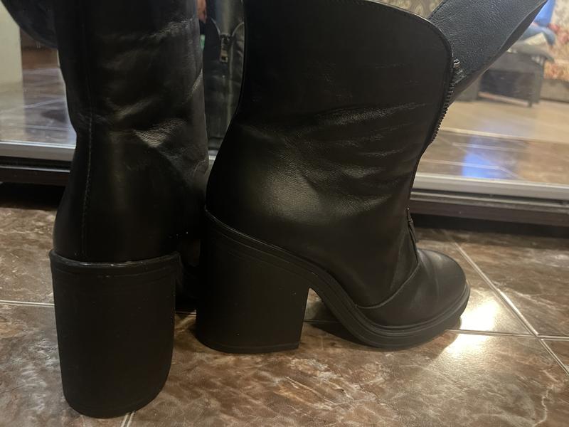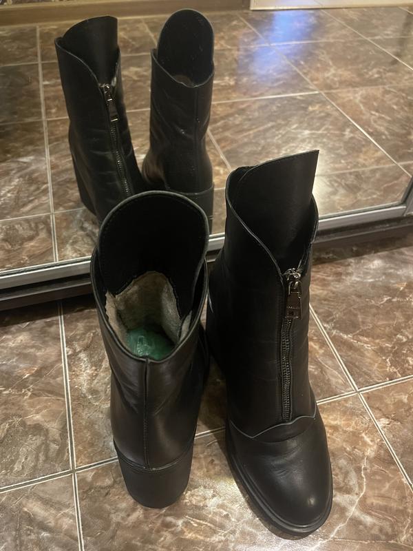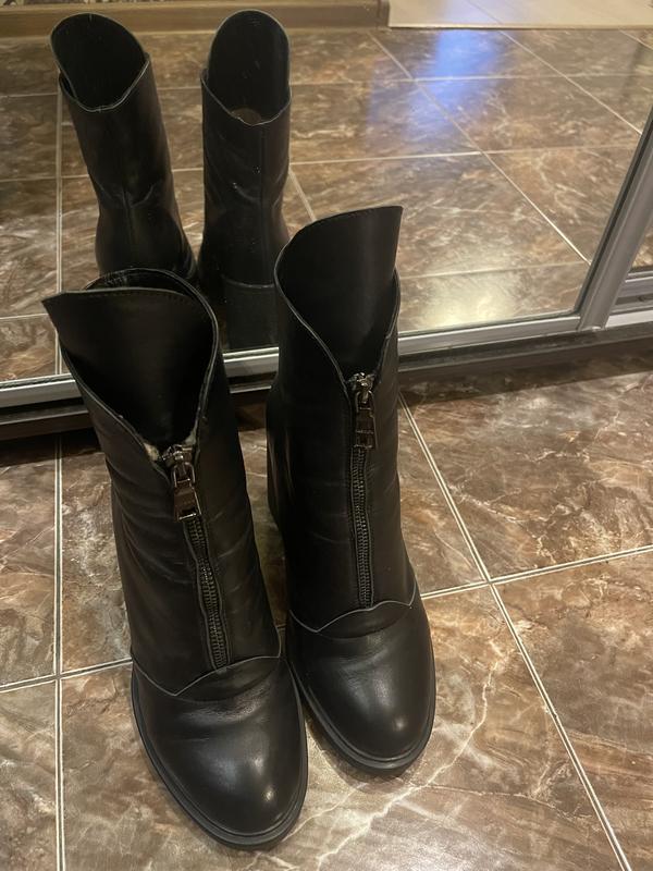 Очень удобная обувь. Стан нового. Размер 38, стелька 24,5 см. Внутри полностью мех, верх натуральная кожа. Толстый трендовый каблук. Высота изделия 23 см, высота каблука 9 см.