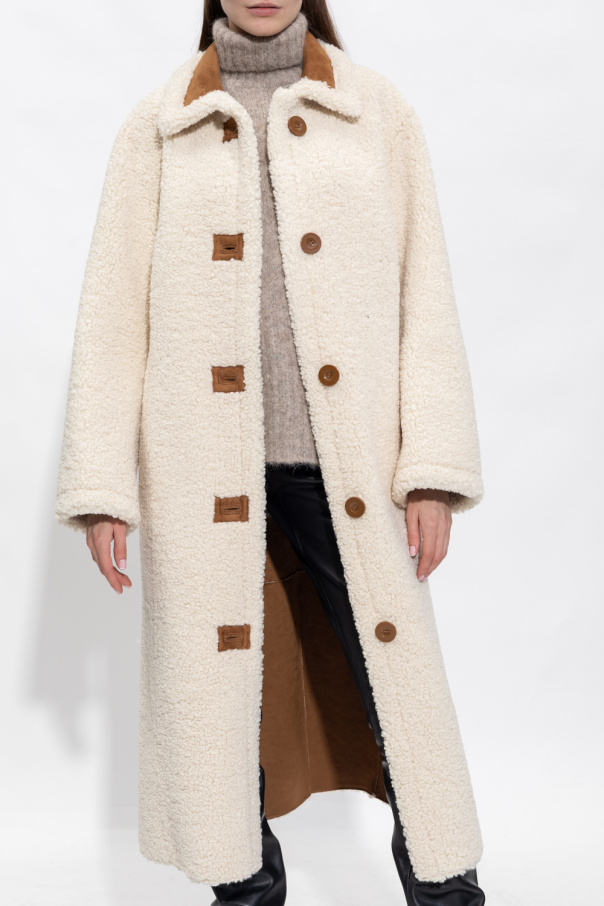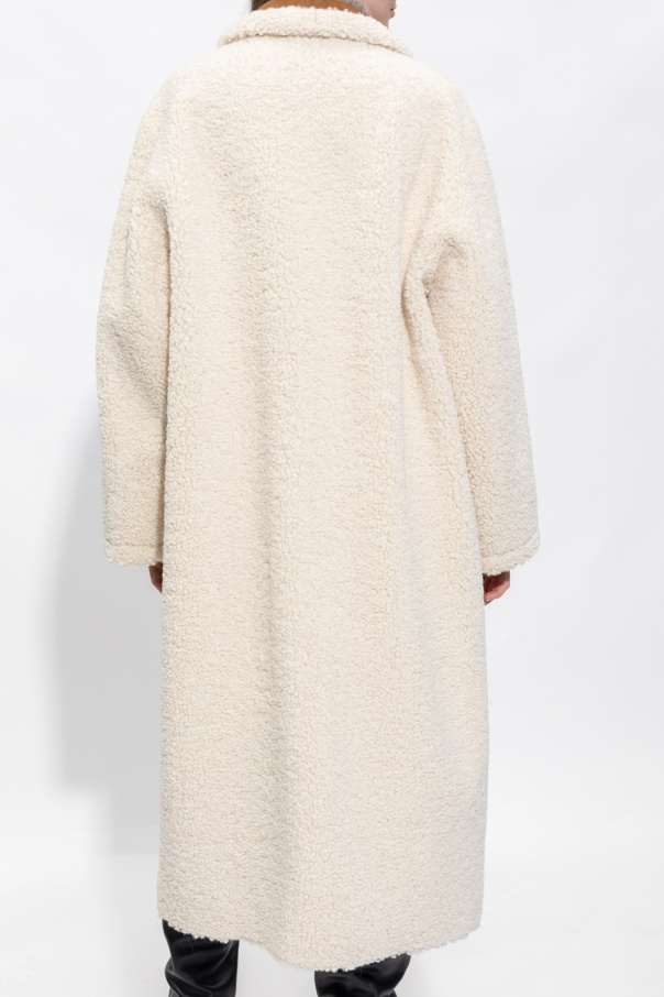 Cream and brown ‘Kanca’ coat from Stand Studio. Crafted from faux fur with a relaxed fit, this style features button fastenings, a collar, two frontal pockets and long sleeves.