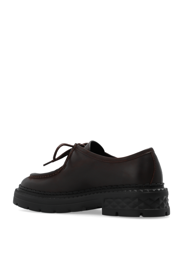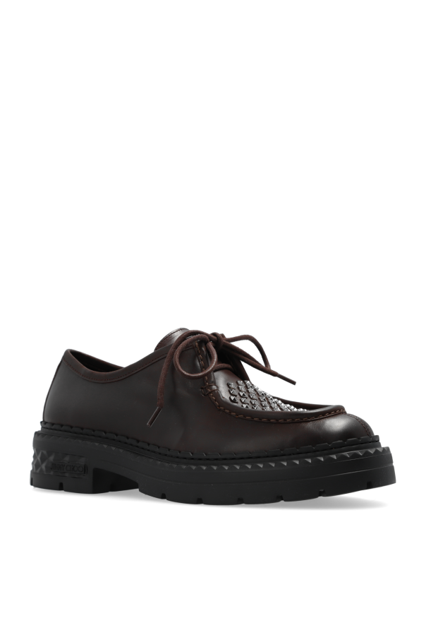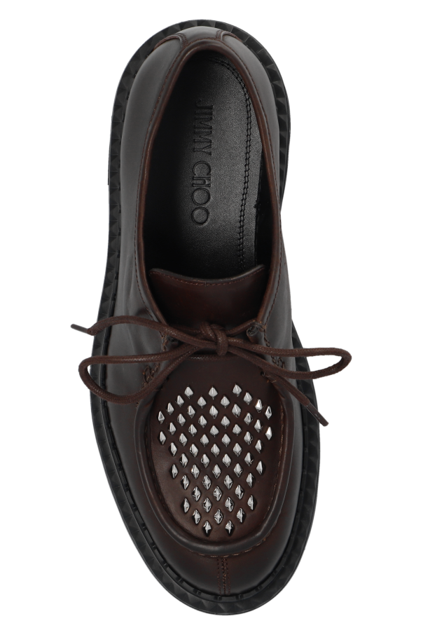 Brown ‘Marlow’ shoes from Jimmy Choo. Made of leather, this lace-up model sits on a black rubber sole and features silver-tone diamond-shaped detailing on the front.