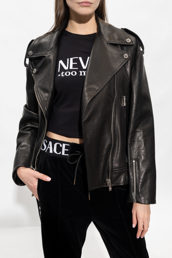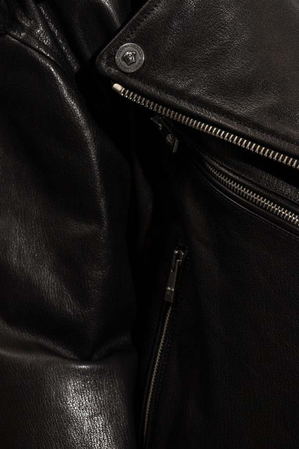 Black loose-fitting biker jacket from Versace. Made of goat leather, this garment features a zip fastening, epaulette details, three zip pockets, one snap-fastened flap pocket and long sleeves with zip details.