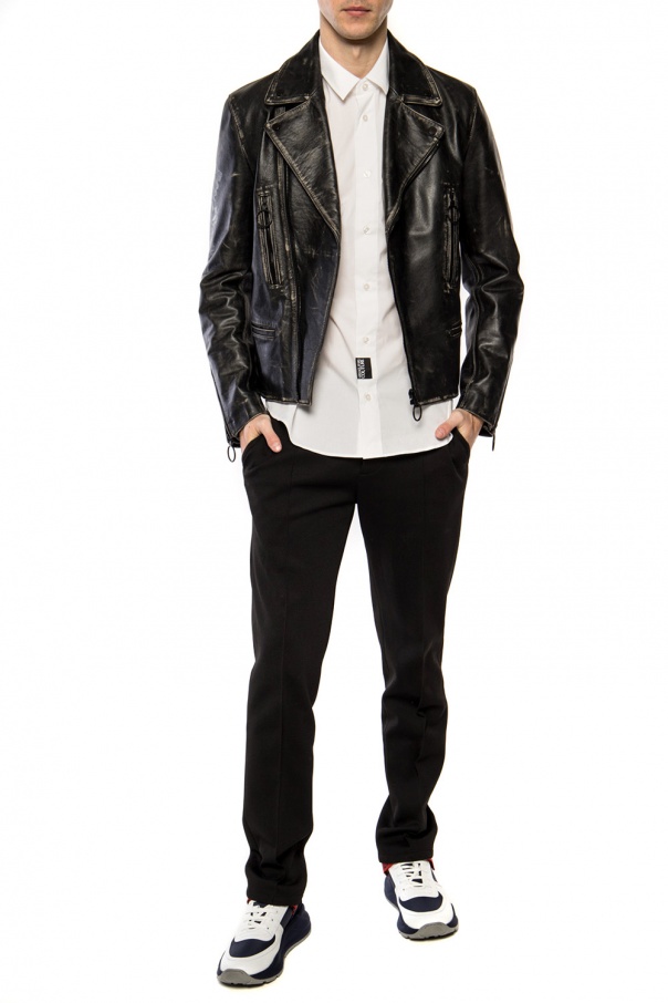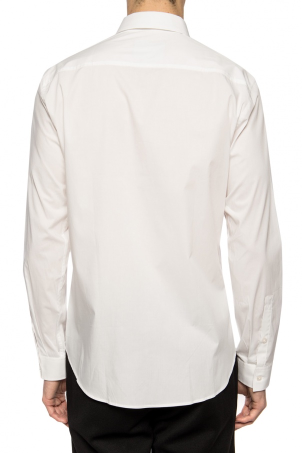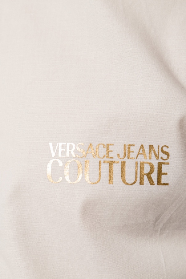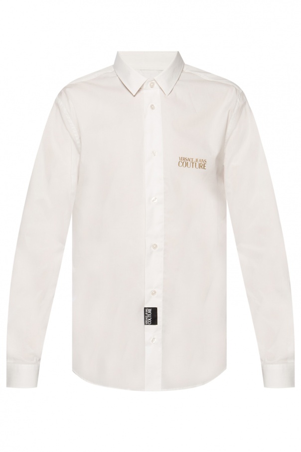White shirt from Versace Jeans Couture. Made of cotton. Fastened via buttons. Features long sleeves as well as black and white logo patch and printed gold-tone logo on the front.