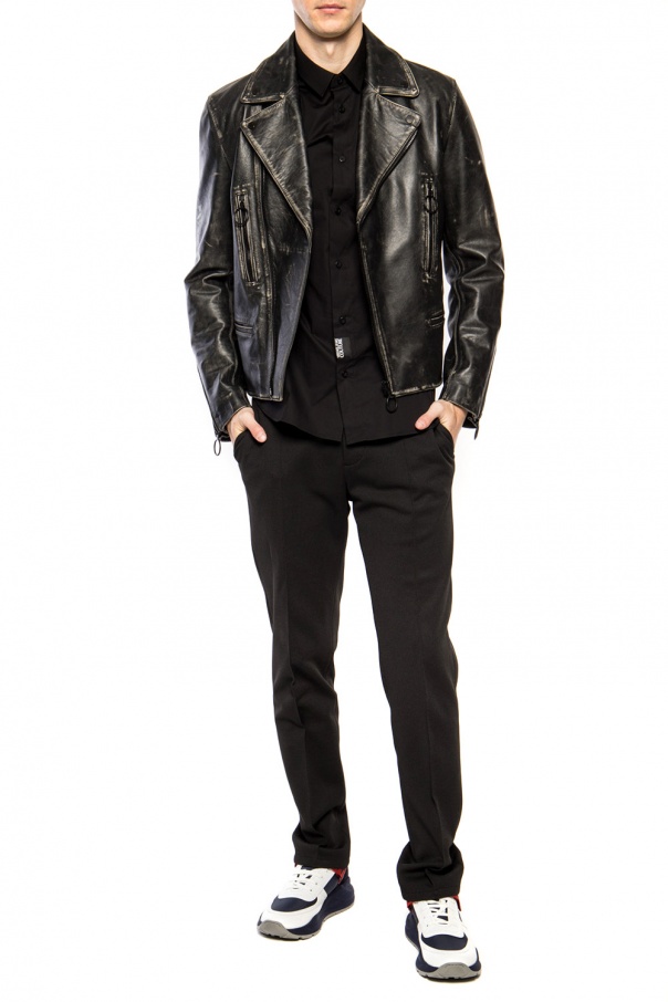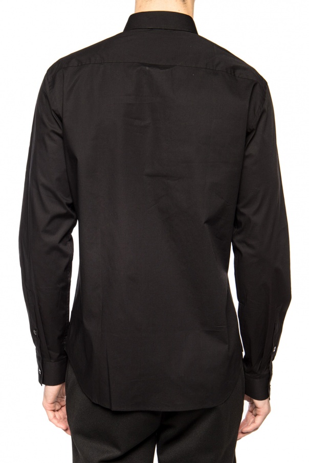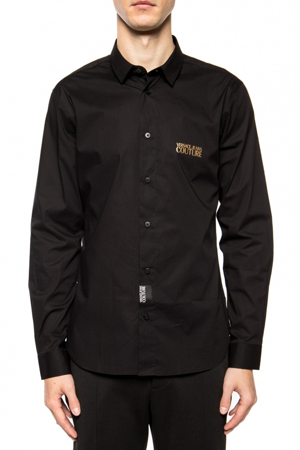 Black shirt from Versace Jeans Couture. Made of cotton. Fastened via buttons. Features long sleeves as well as black and white logo patch and printed gold-tone logo on the front.