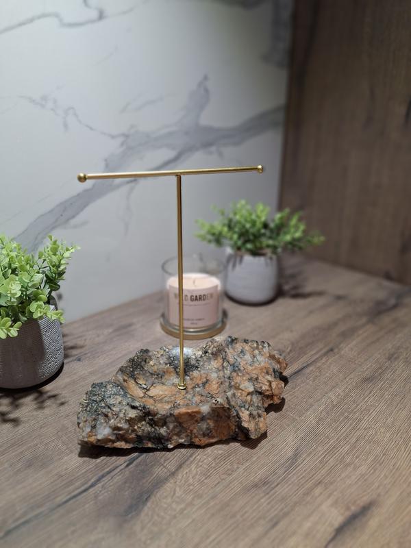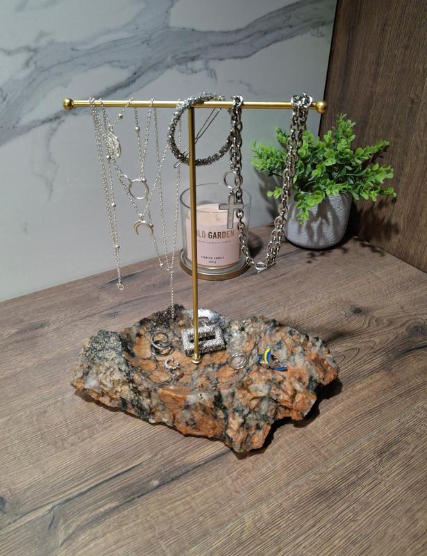 Подставка для украшений от hard.like.a.stone сочетает прочный гранит с изящной металлической Т-образной стойкой, создавая баланс между естественной текстурой камня и современной эстетикой металла. Гранит добавляет подставке массивности и эксклюзивности, а металлическая стойка обеспечивает удобное расположение украшений, делая их центральным акцентом в вашем пространстве.