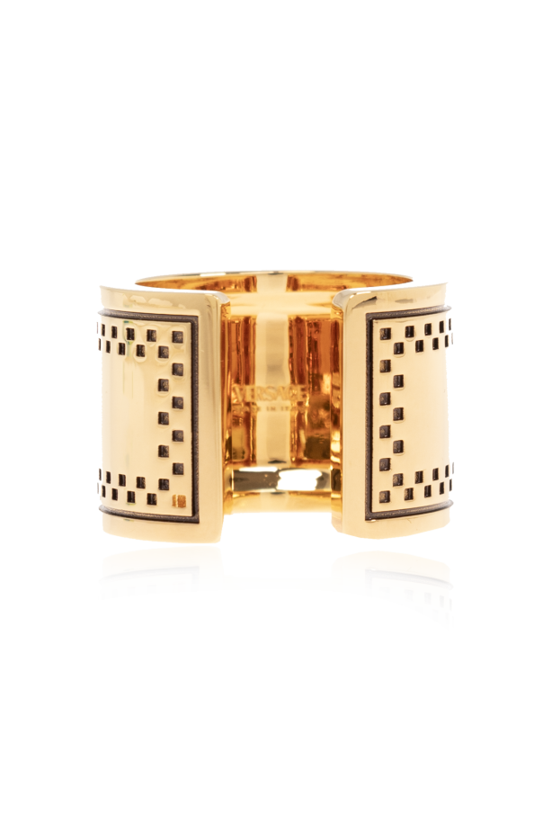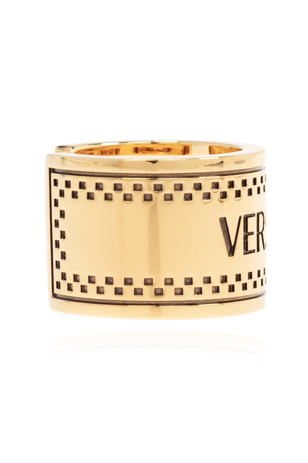 Gold-tone ring from Versace. Made of brass, this item showcases an engraved logo.