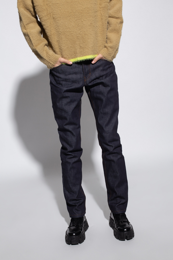 Navy jeans from Ami Alexandre Mattiussi. Made of cotton, this pair falls down with slightly tapered legs and is complete with five slip pockets and a black logo-embossed patch at the back.
