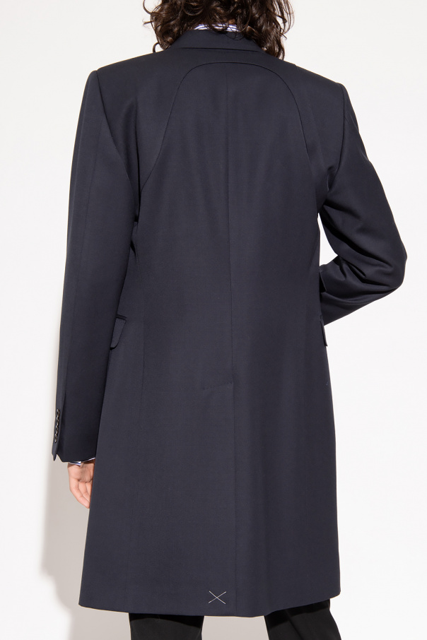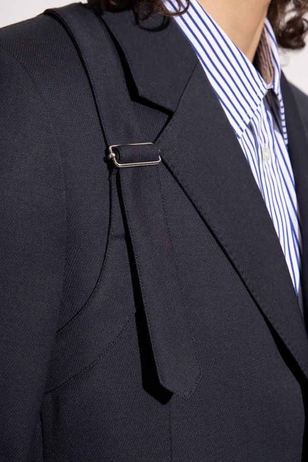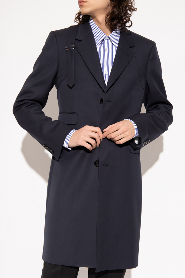 Navy blue coat from Alexander McQueen. Made of wool with a single-breasted silhouette, this style features button fastenings, a collar with notch lapels, a harness-shaped patch, a buckle belt on the front, three flapped pockets, a single back vent and long sleeves with button cuffs.