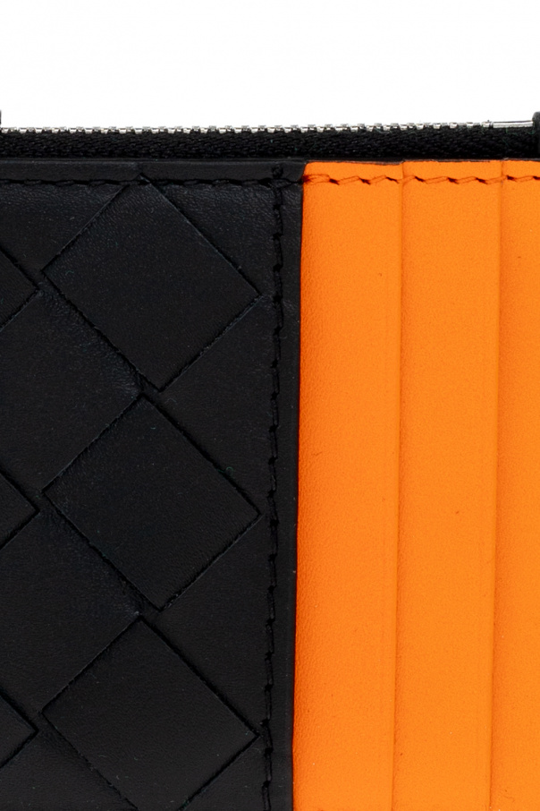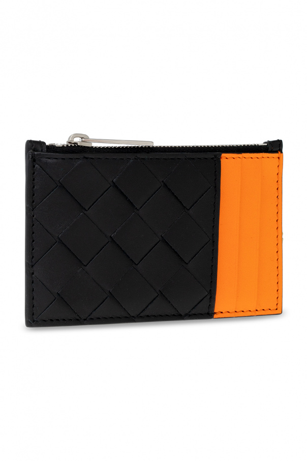 Black and orange card case from Bottega Veneta. Made of calf leather with the brand\'s signature ‘Intrecciato’ weave, this item features three card slots and one coin pocket with a silver-tone zip closure.