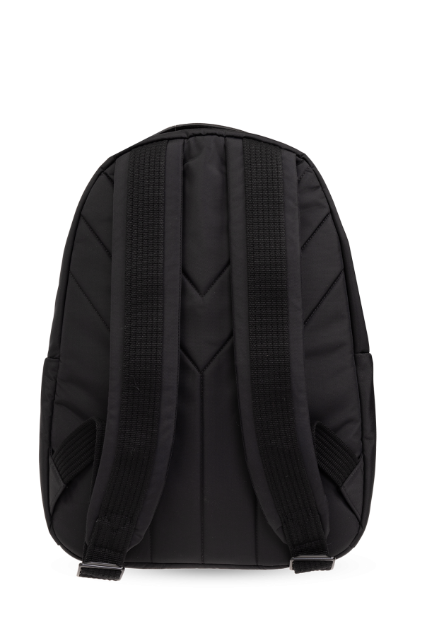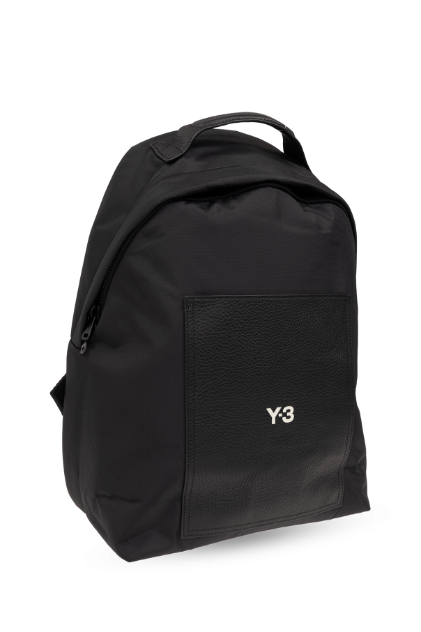 Black backpack from Y-3 Yohji Yamamoto. Made from fabric and trimmed with leather, this design fastens via a two-way zip and showcases a frontal pocket with a printed white logo, one half-round handle, adjustable shoulder straps, silver-tone metal hardware and one internal compartment with one slip pocket and one zip pocket.