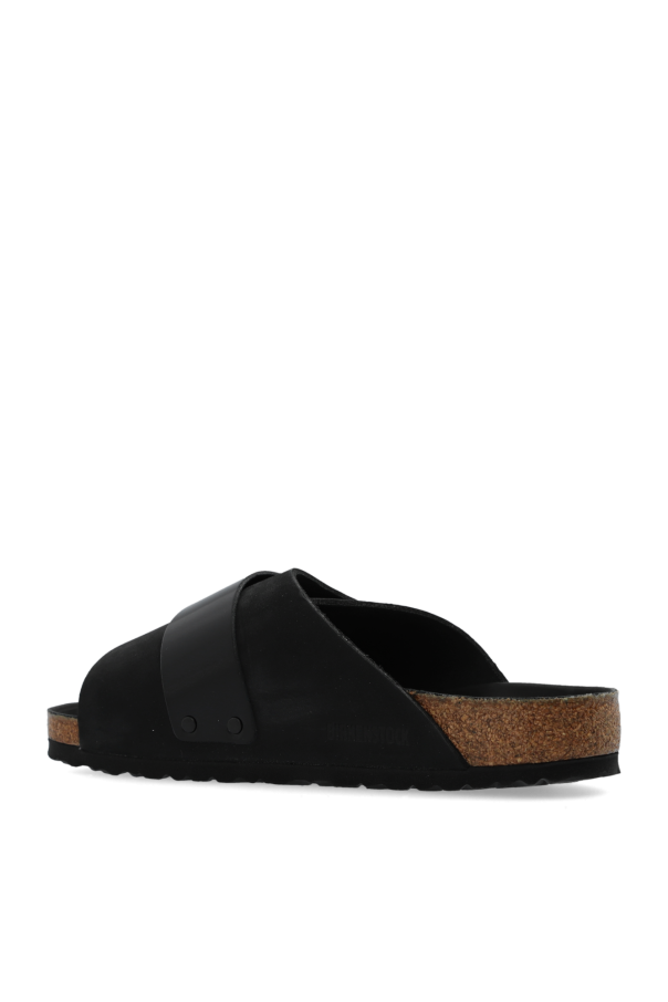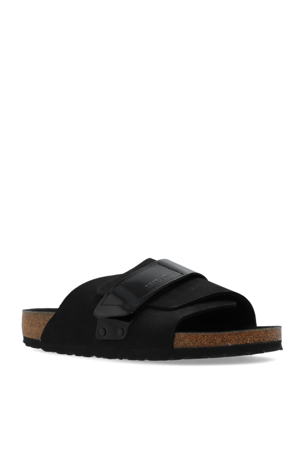 Black ‘Kyoto’ slides from Birkenstock. Made of nubuck and patent leather, this pair features velcro straps, an embossed logo on the front and side, anatomically shaped regular width cork-latex footbed and black EVA sole.