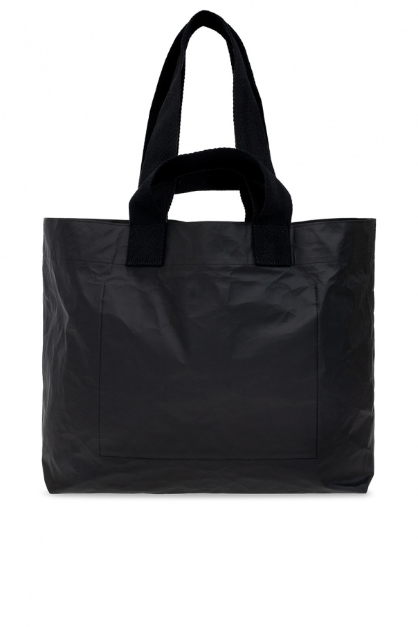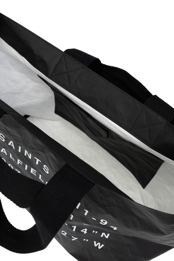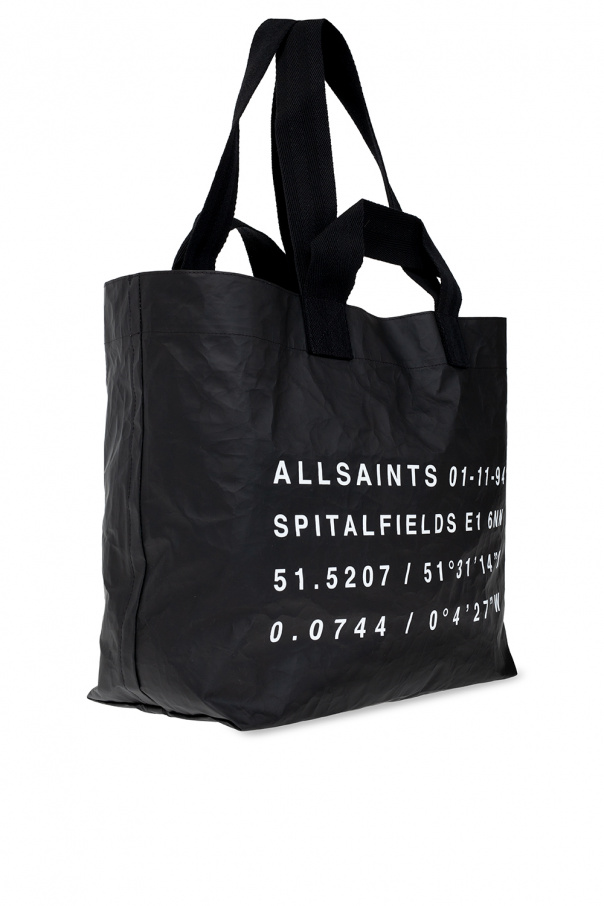 Black ‘Acari’ shopper bag from AllSaints. Crafted from crinkled fabric, this design showcases a white graphic print with the brand\'s logo on the front, four half-round handles in different sizes, and one internal compartment with a slip pocket.