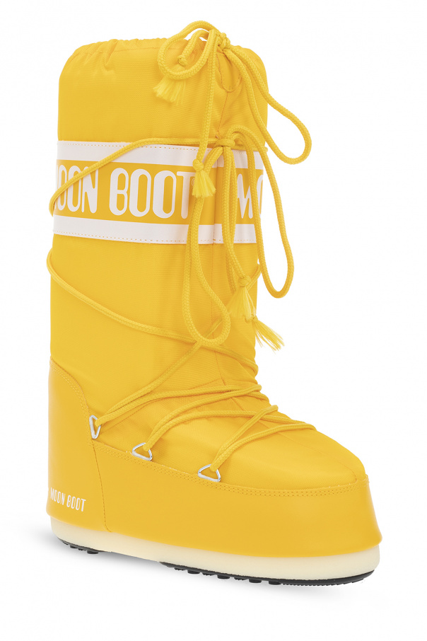 Yellow ‘Nylon’ snow boots from Moon Boot. Resting on a light yellow and black rubber sole, this garment features a white logo print, decorative lacing and silver-tone metal hardware. Inspired by the peculiar shape and technology of the astronauts’ boots, the iconic style was designed in 1969 after the first Moon landing.