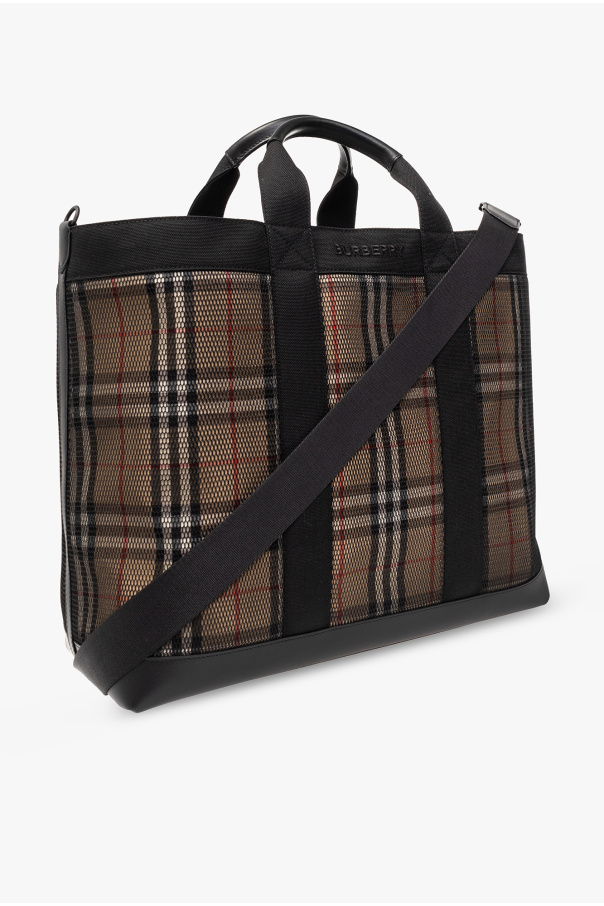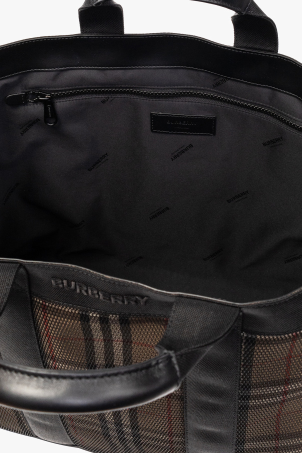 Black and beige ‘Ormond’ shopper bag from Burberry. Made of fabric with mesh and calf leather trims, this model is decorated with the brand’s signature check and complete with two handles and one internal compartment with one zip pocket and two slip pockets.