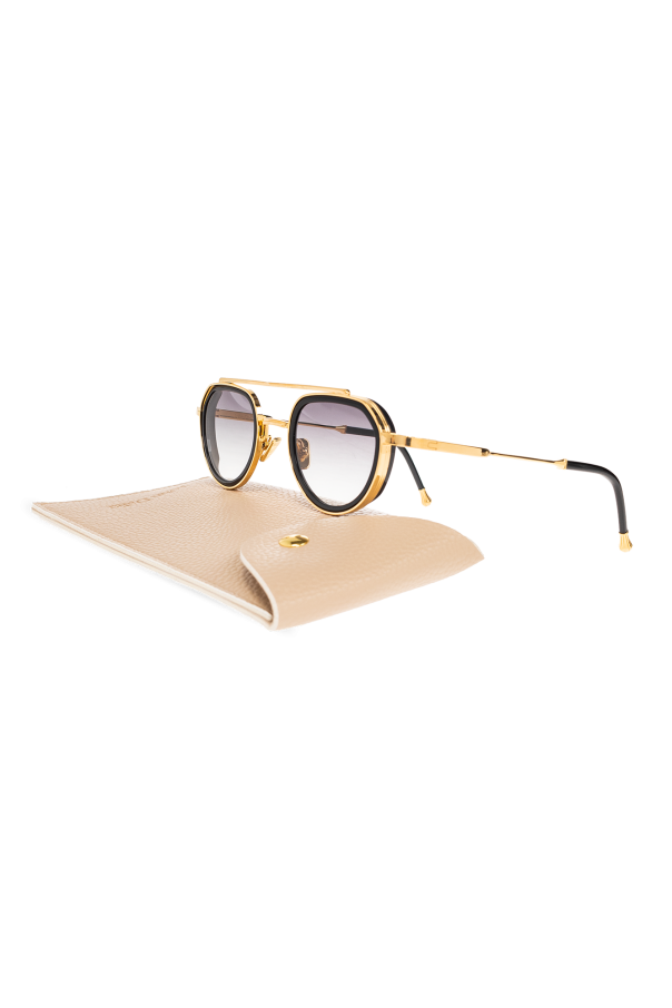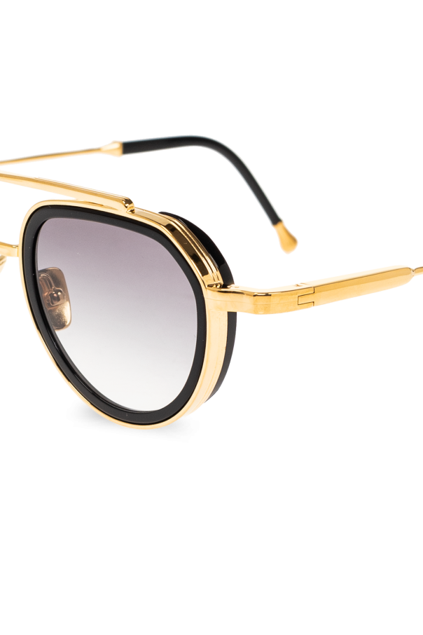 Black and gold-tone ‘Julia’ sunglasses from John Dalia. A feminine oval aviator shape with acetate rims cut that stands out from the 4mm streak-engraved metal. Double bridge complete with adjustable branded nose pads. 22-carat yellow gold-plated alloy frame (c. 5µ layer and jewelry stamp inside the temple). Grey gradient CR39 lenses with AR treatment and UV protection. Case included. Handmade in France.
