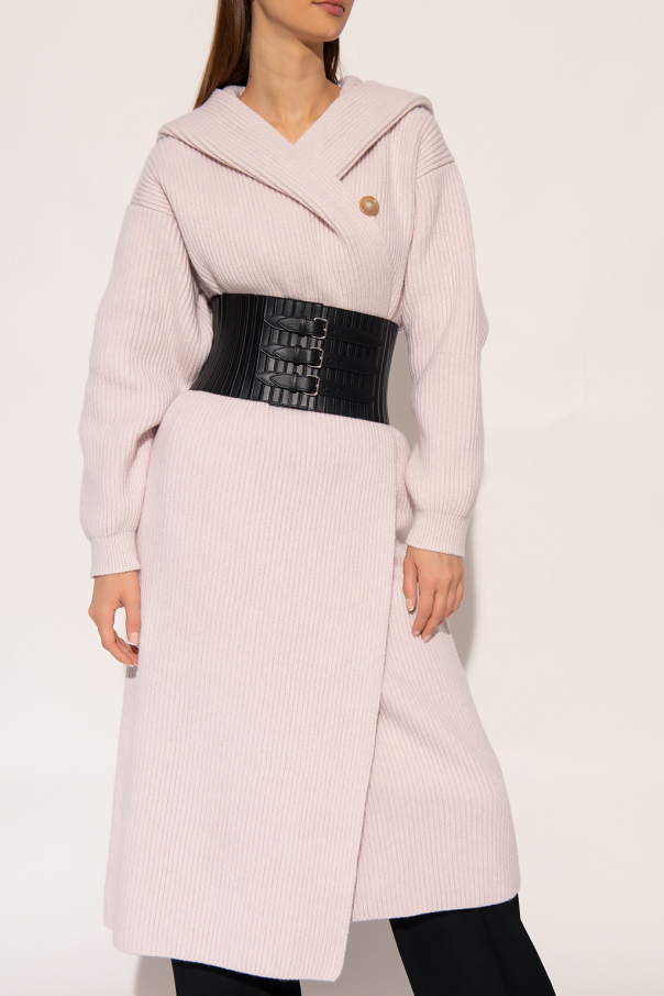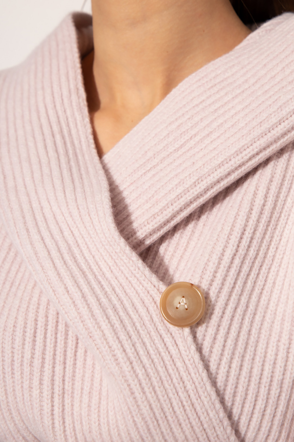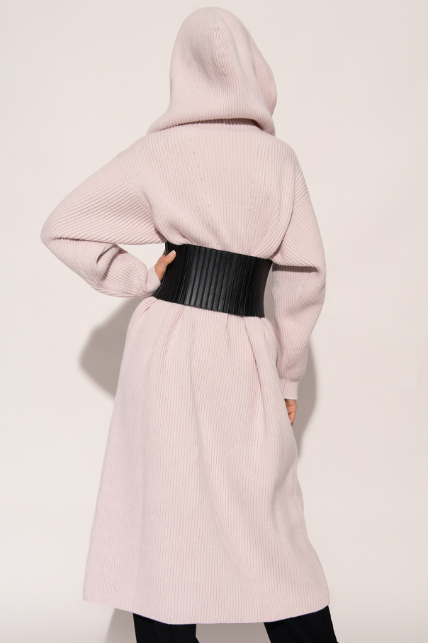 Long, light pink hooded cardigan from Alaia. Made of wool, this long sleeve design fastens with buttons.
