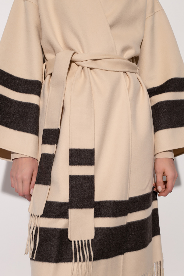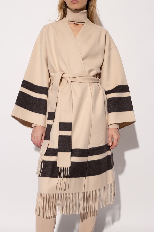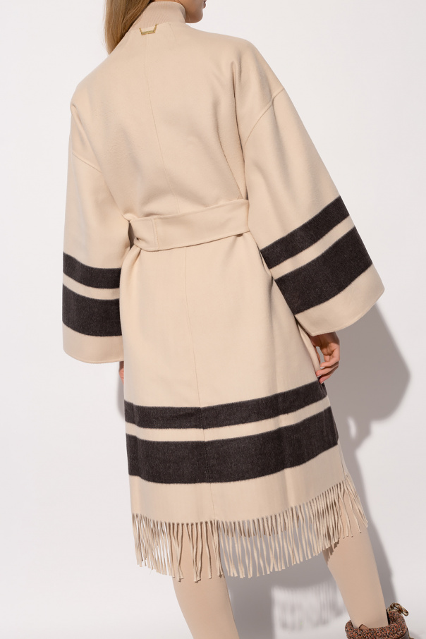 Cream coat from Zimmermann. Crafted from wool, this style showcases a brown stripe pattern, two slip pockets and fringe detailing.