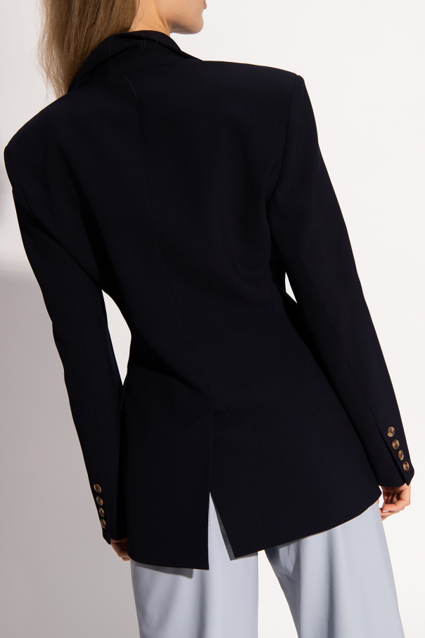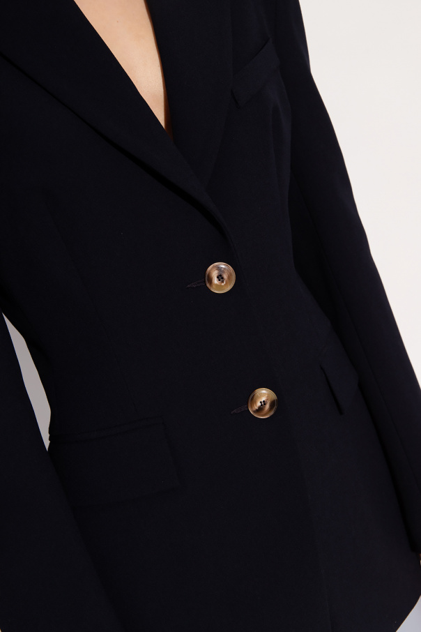 Navy blazer with notch lapels from Nanushka. Fastened with two beige buttons, this garment is complete with two flap pockets, one slip pocket and a single rear vent.