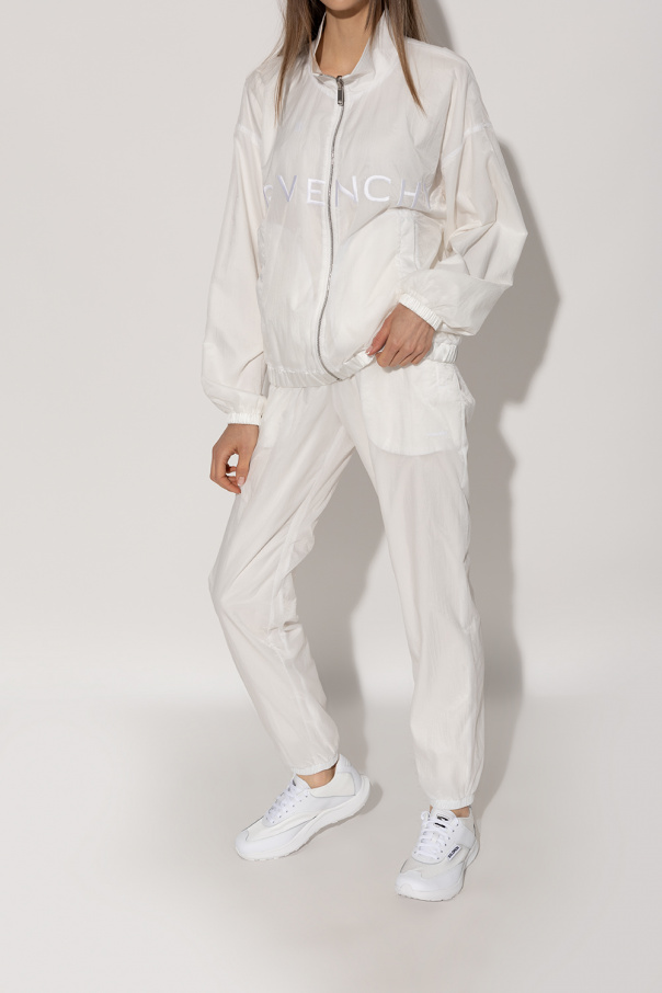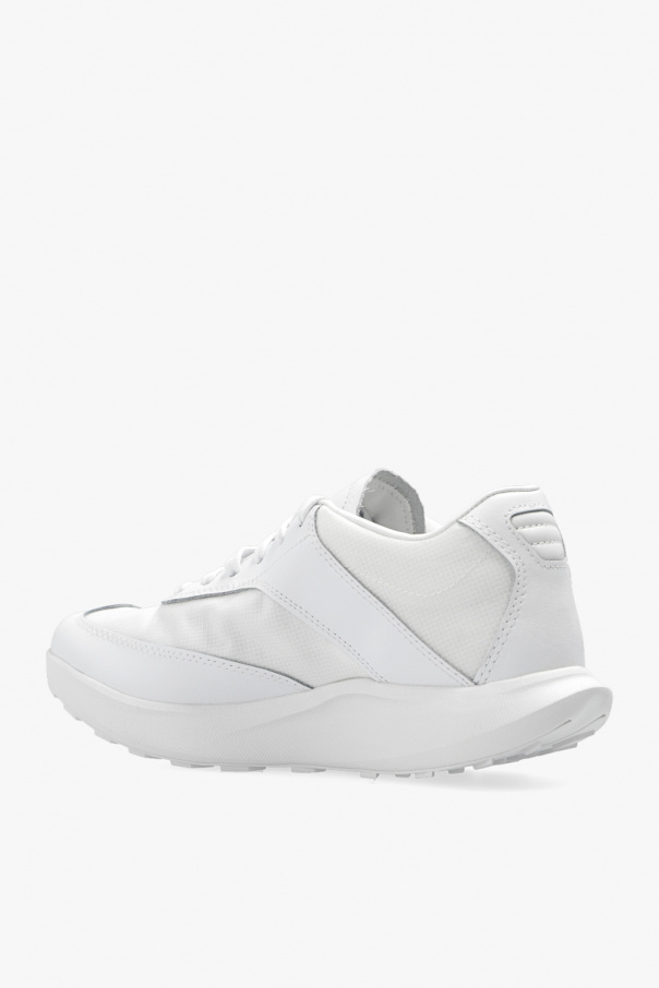 White ‘SR 90’ sneakers from Comme des Garcons x Salomon. Crafted from leather and fabric, this lace-up model sits on a white rubber sole and features a patch with a black logo on the side.