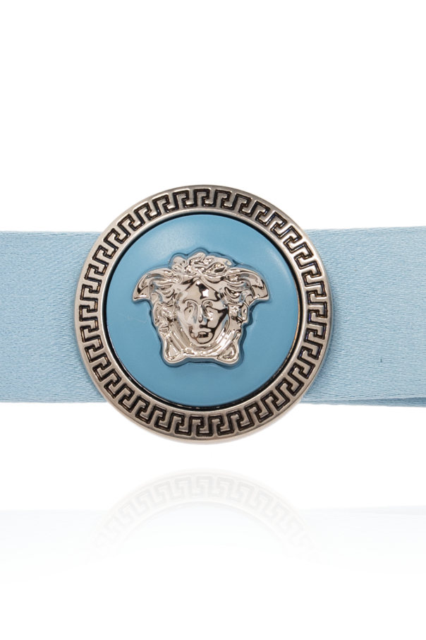 Introducing an exquisite addition to your fashion accessory collection: the Versace Blue Satin Hair Clip. This piece, emanating from the prestigious house of Versace, is a testament to the brand\'s commitment to luxury, quality, and distinctive style. Crafted with precision, the clip features a sleek, rectangular satin ribbon with softly rounded edges, indicating a product of superior quality. The centerpiece, an ornate medallion showcasing a three-dimensional lion’s head, set against a contrasting backdrop, highlights the intricate details and craftsmanship. Encircling the lion, a classic Greek meander pattern adds a touch of elegance and timeless beauty. The clip\'s mechanism, designed for ease of use, ensures a secure grip on your hair, while its metallic components suggest durability. Whether showcased in your locks or admired as a piece of art, this Versace hair clip, with its detailed execution and high-quality materials, speaks volumes of its luxurious origins. Why Purchase This Product? Exclusive Design: Featuring Versace\'s iconic Medusa head and Greek pattern for a touch of classical elegance. High-Quality Materials: Crafted from satin and brass, ensuring both beauty and longevity. Functional Elegance: A simple yet secure clasp mechanism allows for easy application and sturdy hold. Versatile Style: Perfect for adding a sophisticated touch to any outfit, this clip transcends ordinary accessories.