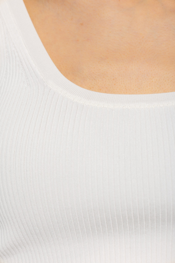 White tank top from Zimmermann. Crafted from ribbed knit with a form-fitting silhouette, this style features a ‘U’ shaped neckline and elasticized trims on the edges.