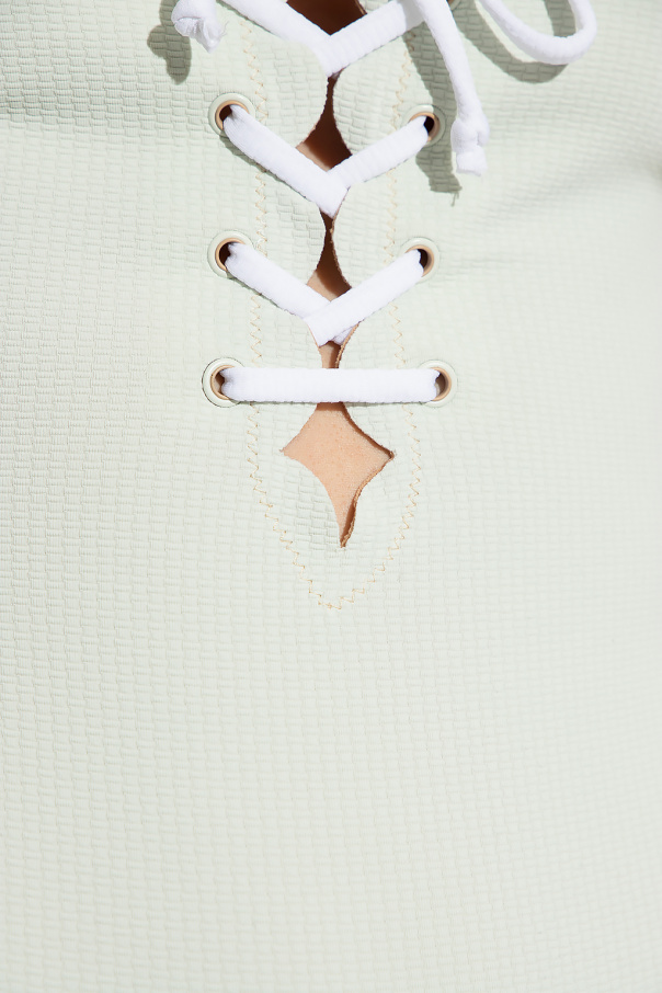 Beige and light green ‘Chesapeake’ one-piece swimsuit from Marysia. Crafted from stretchy fabric with a texture, this style features the brand\'s signature raw edge, hand cut scalloped edges and a tied front.