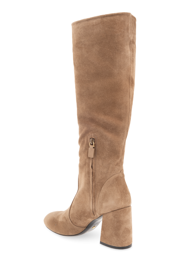 Beige ‘Flareblock’ heeled boots from Stuart Weitzman. Made of suede, this model sits on a black leather sole and features a side zip.