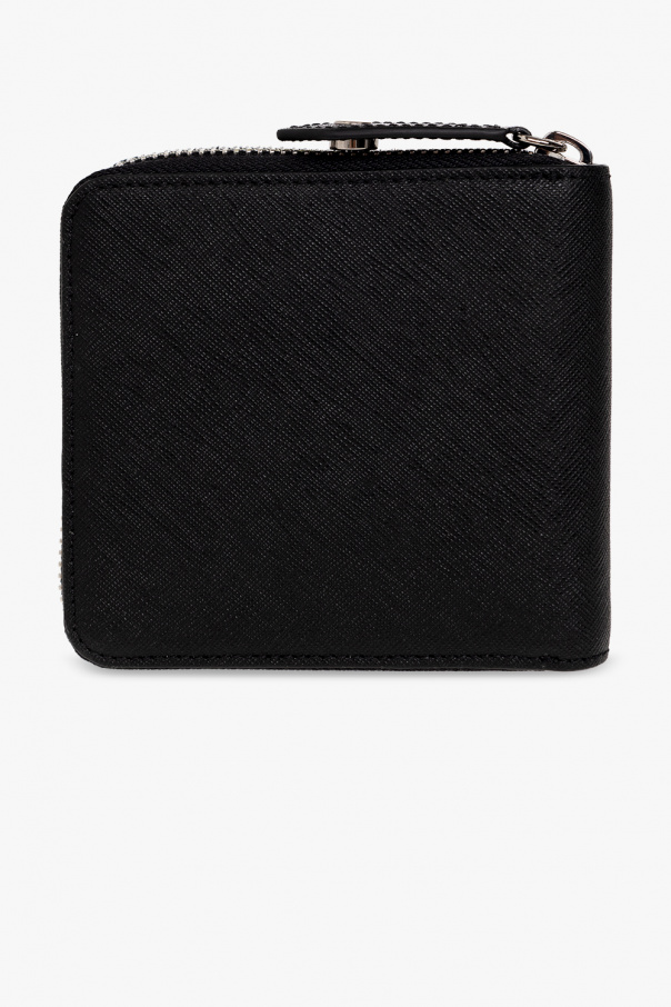 Black, square wallet from Vivienne Westwood. Made of leather, this item fastens with a zip and is decorated with a silver-tone metal logo appliqué. It is complete with a bill compartment, three slip pockets, snap-fastened coin pocket and three card slots.