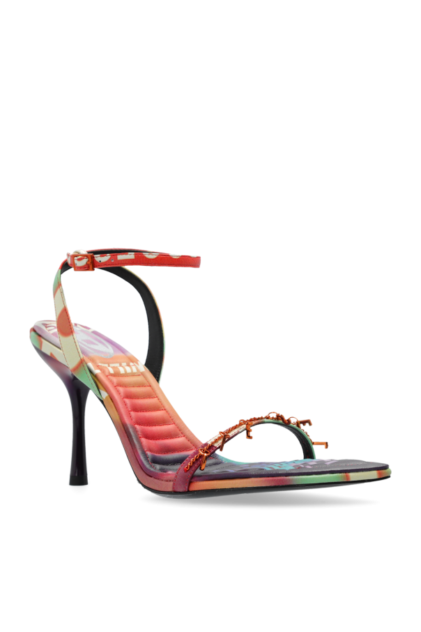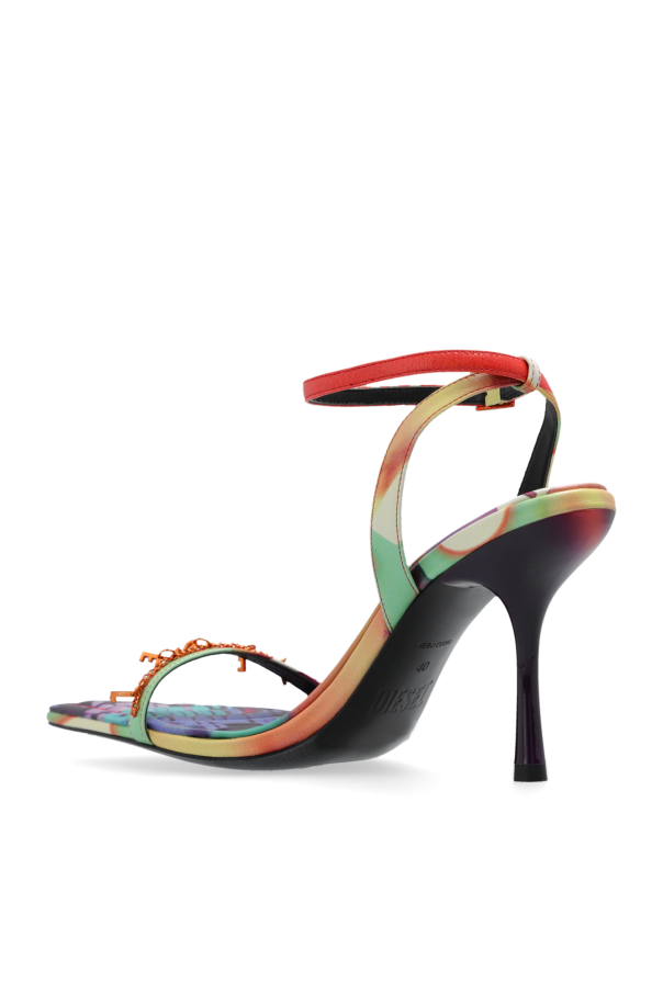 Multicolored ‘D-VINA CHARM’ heeled sandals from Diesel. Made of leather with a decorative print, this pair features an adjustable buckled ankle strap, strap with a chain and logo charms, pointed toe, rose gold-tone metal hardware and black leather sole.