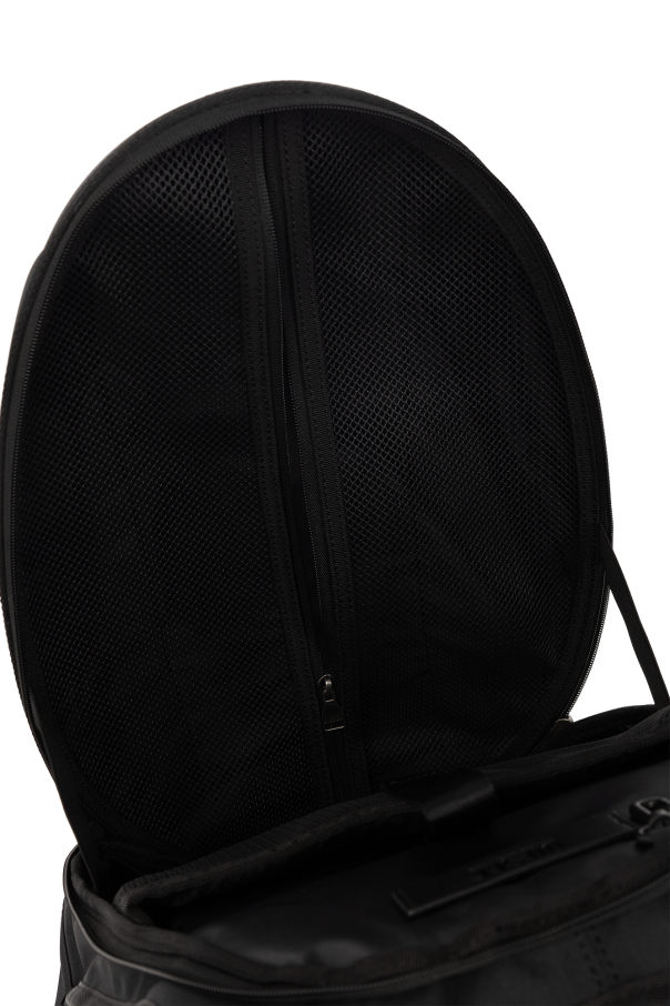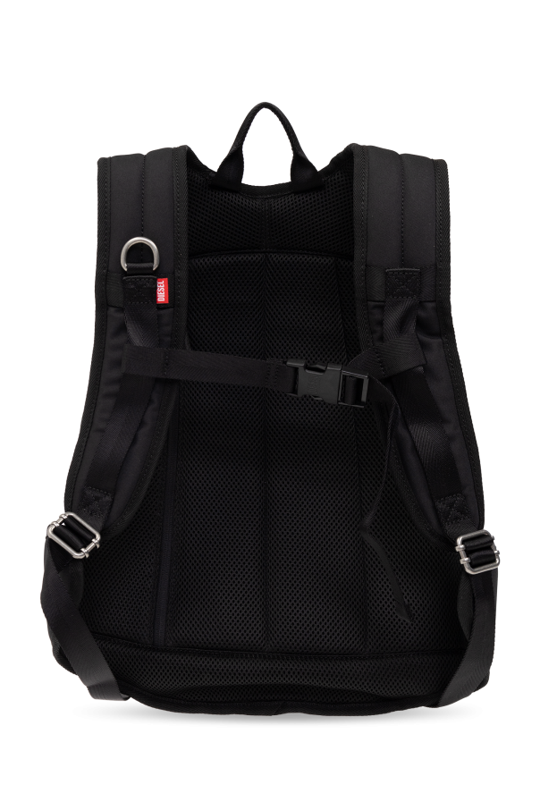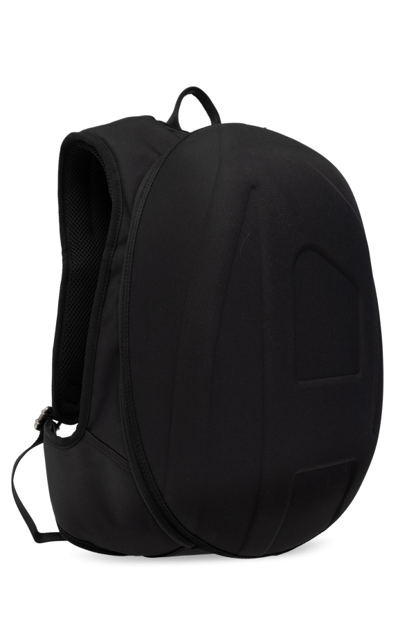 Black ‘1DR-POD’ backpack from Diesel. Fastened with a two-way zip, this model features a tactile logo, zipped back pocket, half-round handle, adjustable shoulder straps with a snap-button strap and silver-tone metal hardware. It has one internal compartment with one zip pocket, one pocket with a velcro closure and a carabiner clip on a strap.