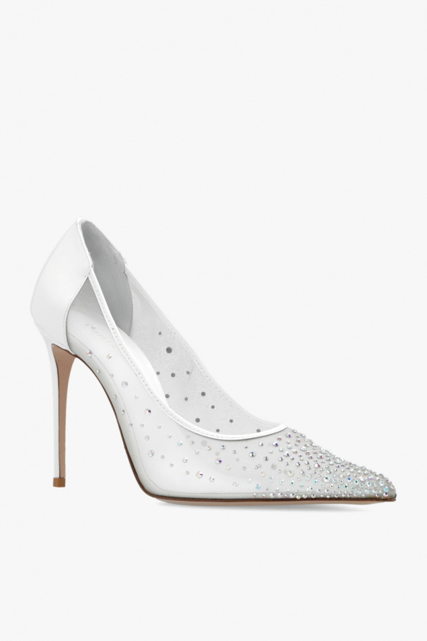 White ‘Nicole’ pumps from Le Silla. Made from leather and transparent mesh bejewelled with glossy rhinestones, this model features a pointed toe silhouette and a beige leather sole.