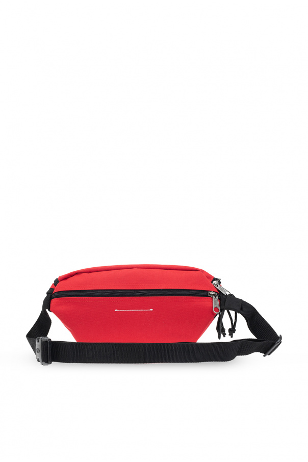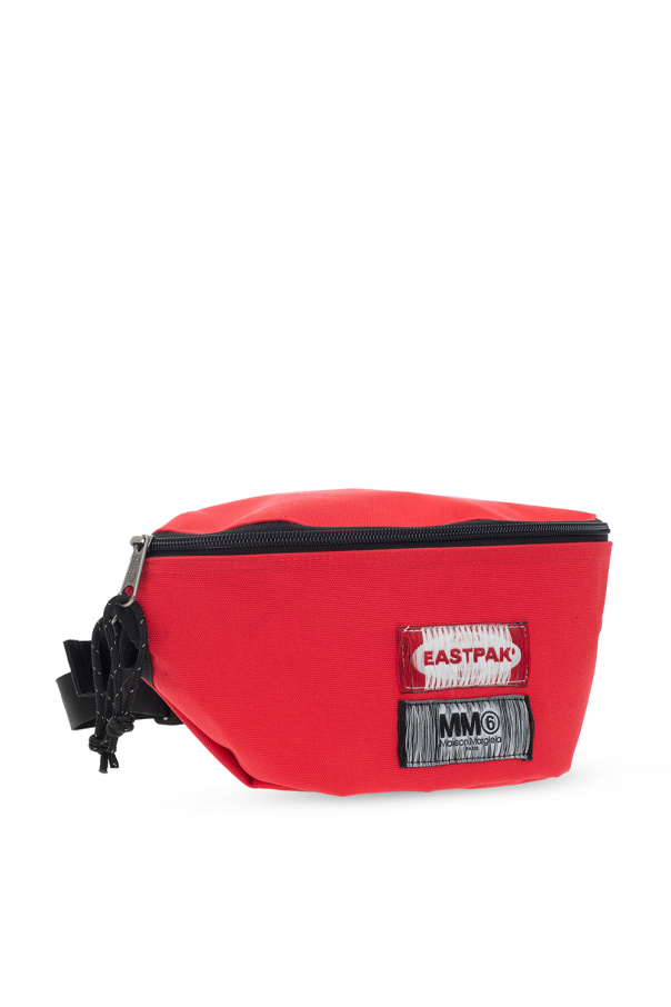 Belt bag from MM6 Maison Margiela x Eastpak. Emblazoned with a logo patch, this design features a two-way zipper, an adjustable strap and silver-tone metal hardware. It reverses between a white and black side with one internal zipped pocket and a red side with a back zipped pocket.